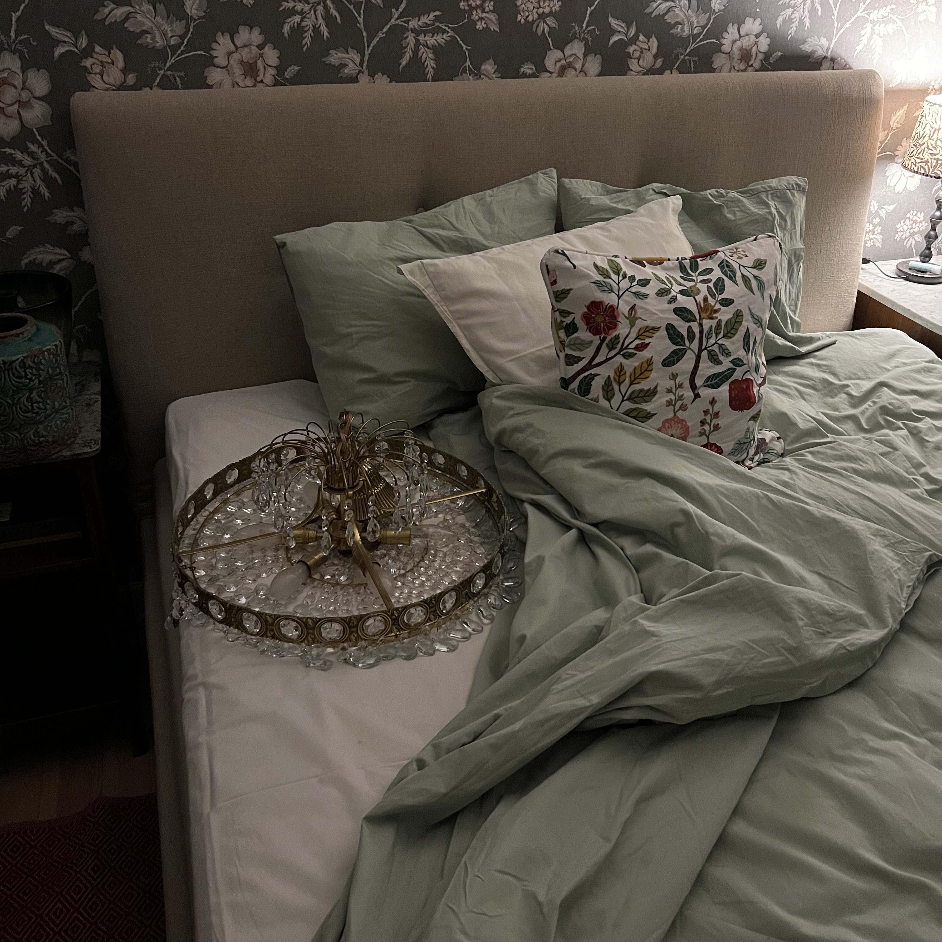 Det positiva med den ljusare färgen är att den funkar med den grå listfärgen jag använt i mellanrummet, köket och hallen. Det vore ju najs att ha den i alla rum och framförallt på listen runt fönstret, som en inramning. Kanske skulle man även kunna ha den som panel, om saker skulle spåra ur. Men nu måste jag sova, jag och kronan, som faktiskt fick ta plats på ett täcke på golvet.
